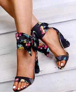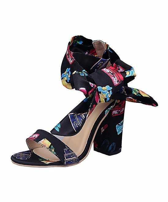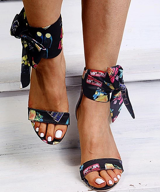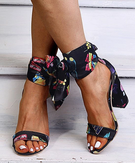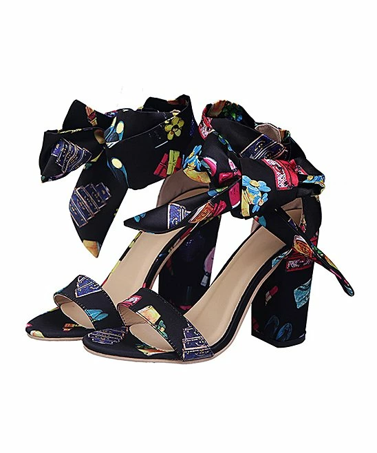 Finish off your casual jeans or fitted skirt with femininity by slipping on these eye-catching pumps adorned with a colorful cosmetics print and an oversize bow.