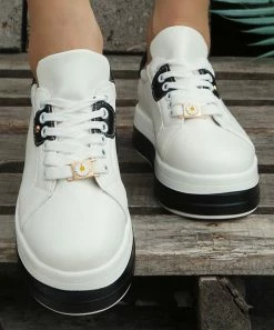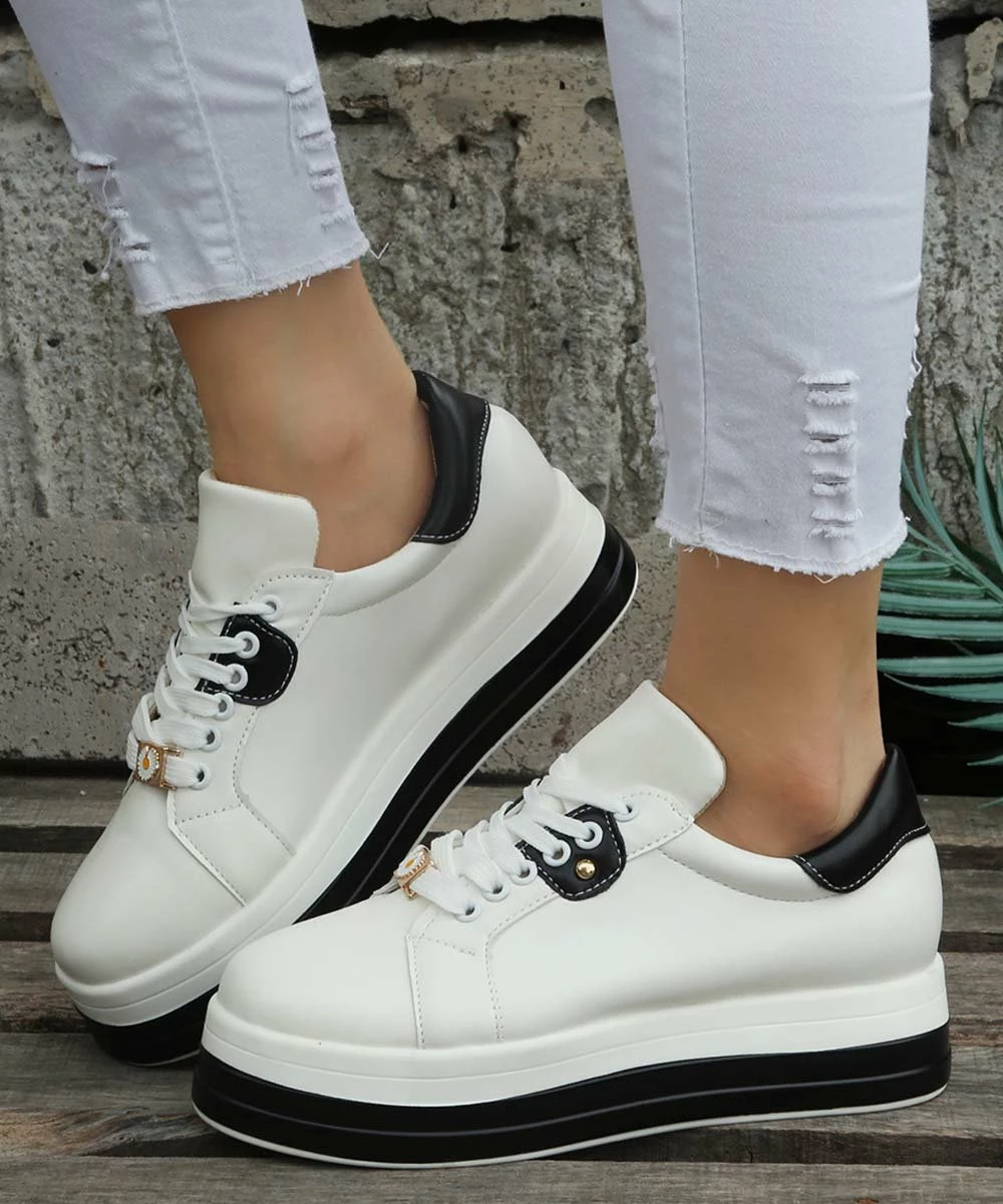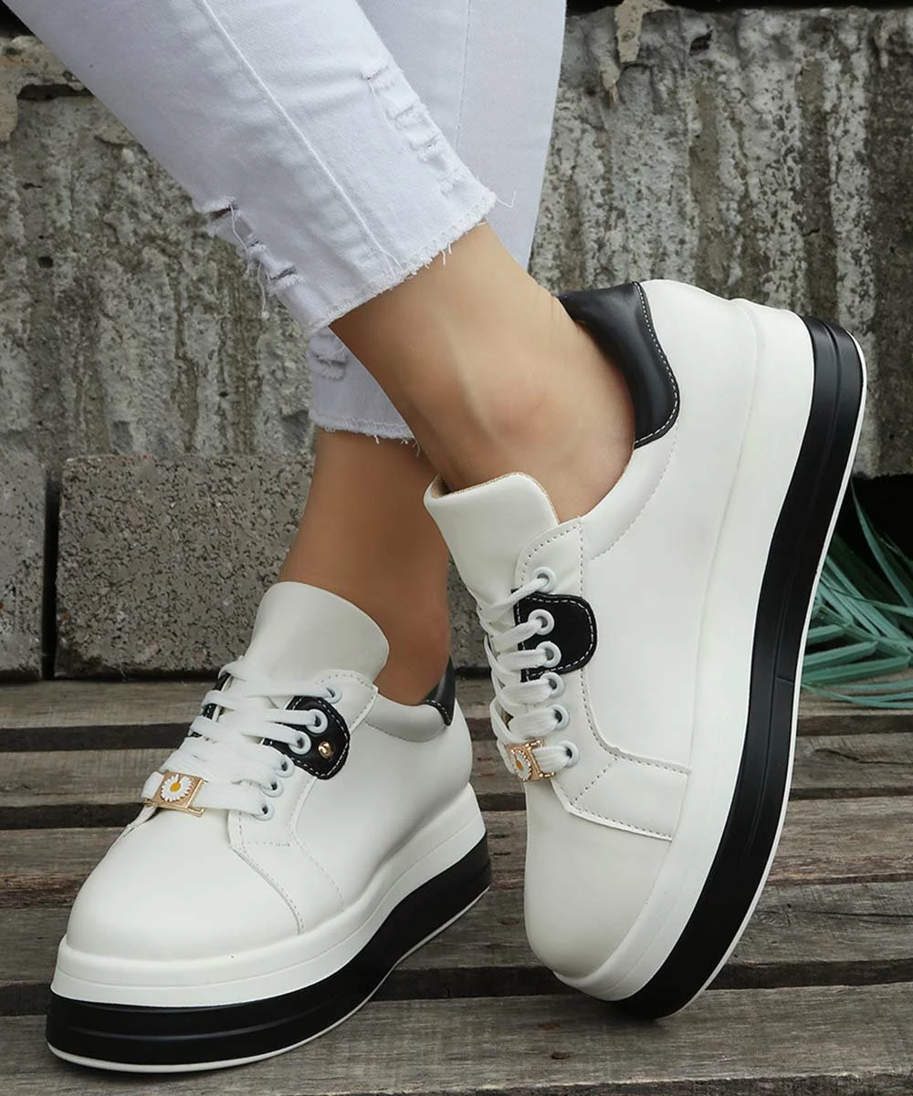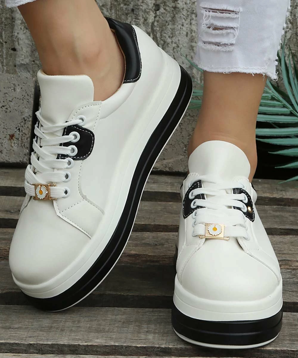 These trendy sneakers combine a chunky platform with a daisy charm accent.