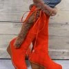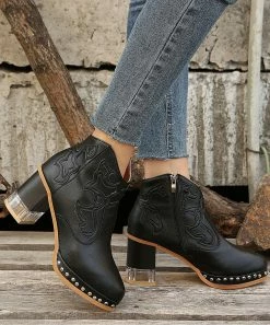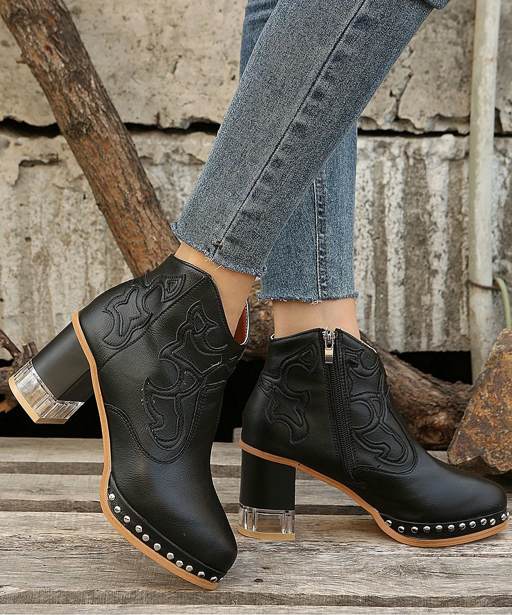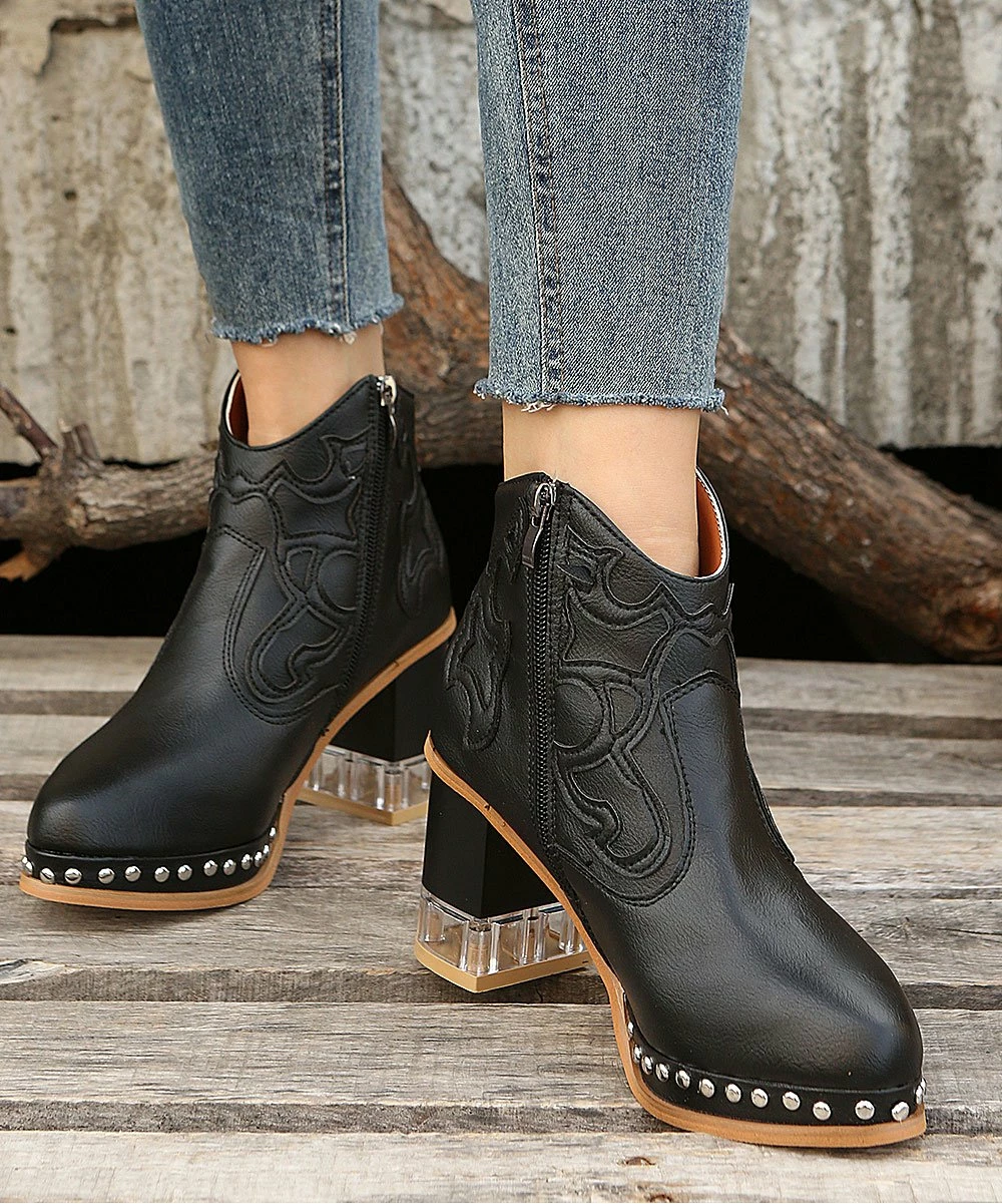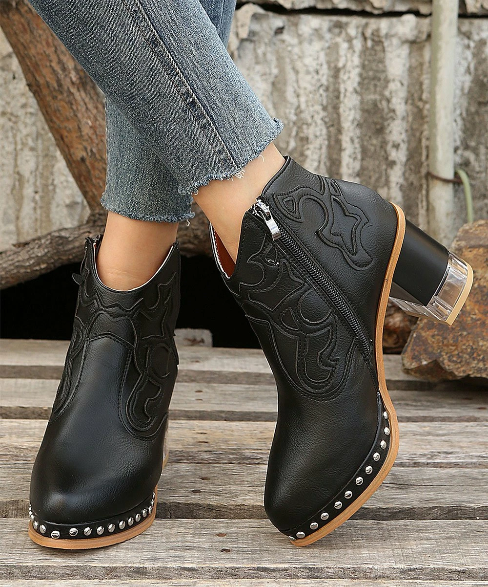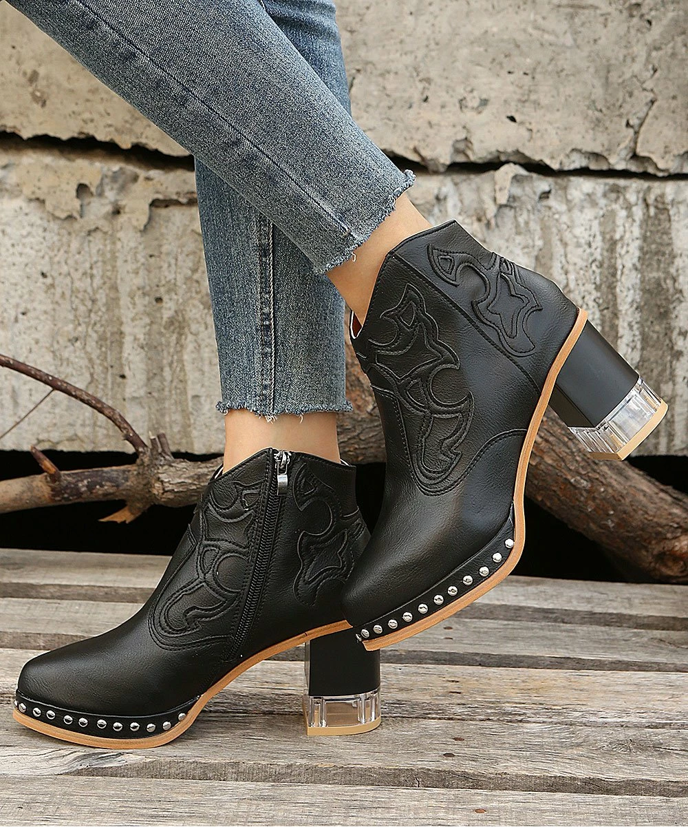 This stylish pick offers an embossed studded upper that gives the look of a low cowboy boot. Partly clear heels finish off the chic pair.
