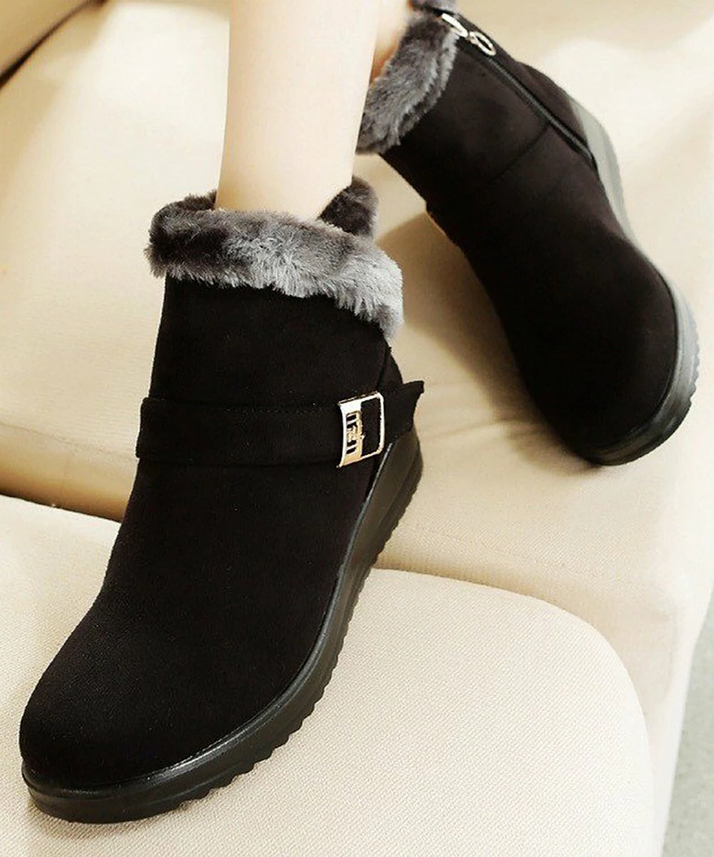 Keep warm and comfy when you don these bold boots offering a decorative ankle buckle and plush faux fur lining for cozy style.