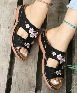 Slide through your day in these sandals that feature comfy wide straps with a floral accent and a convenient slip-on design.