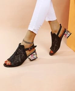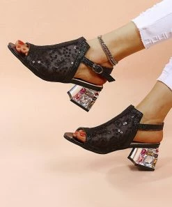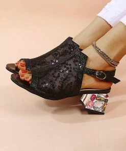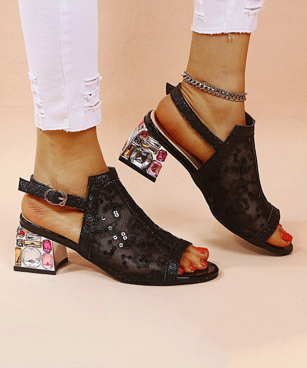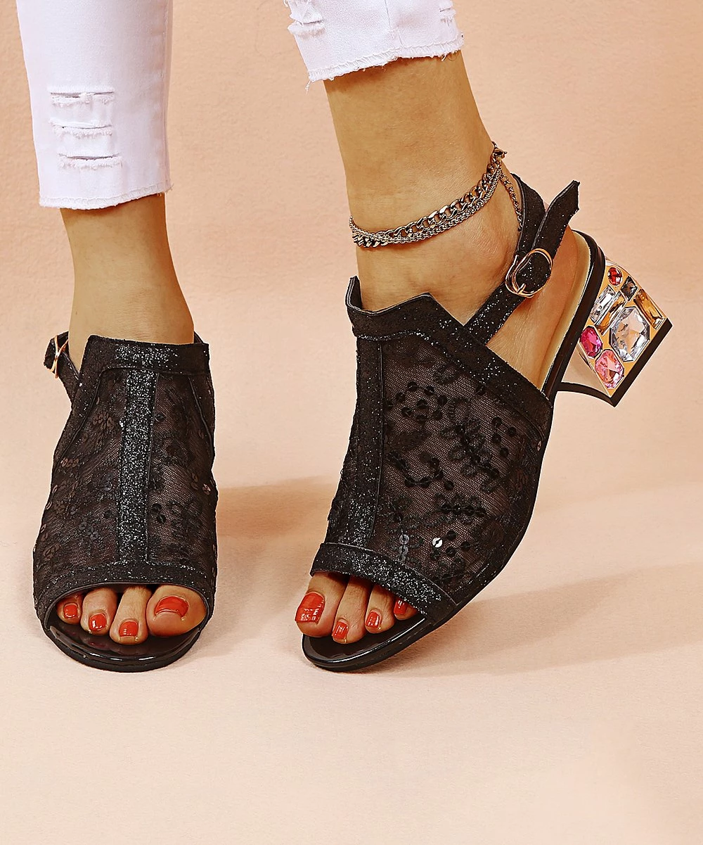 Complement your favorite looks with this flirty peep-toe pump boasting a floral lace design decorated with sequins and a chunky rhinestone-studded block heel.