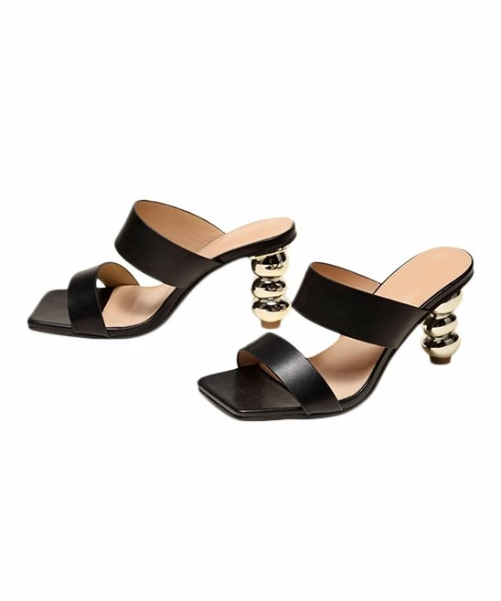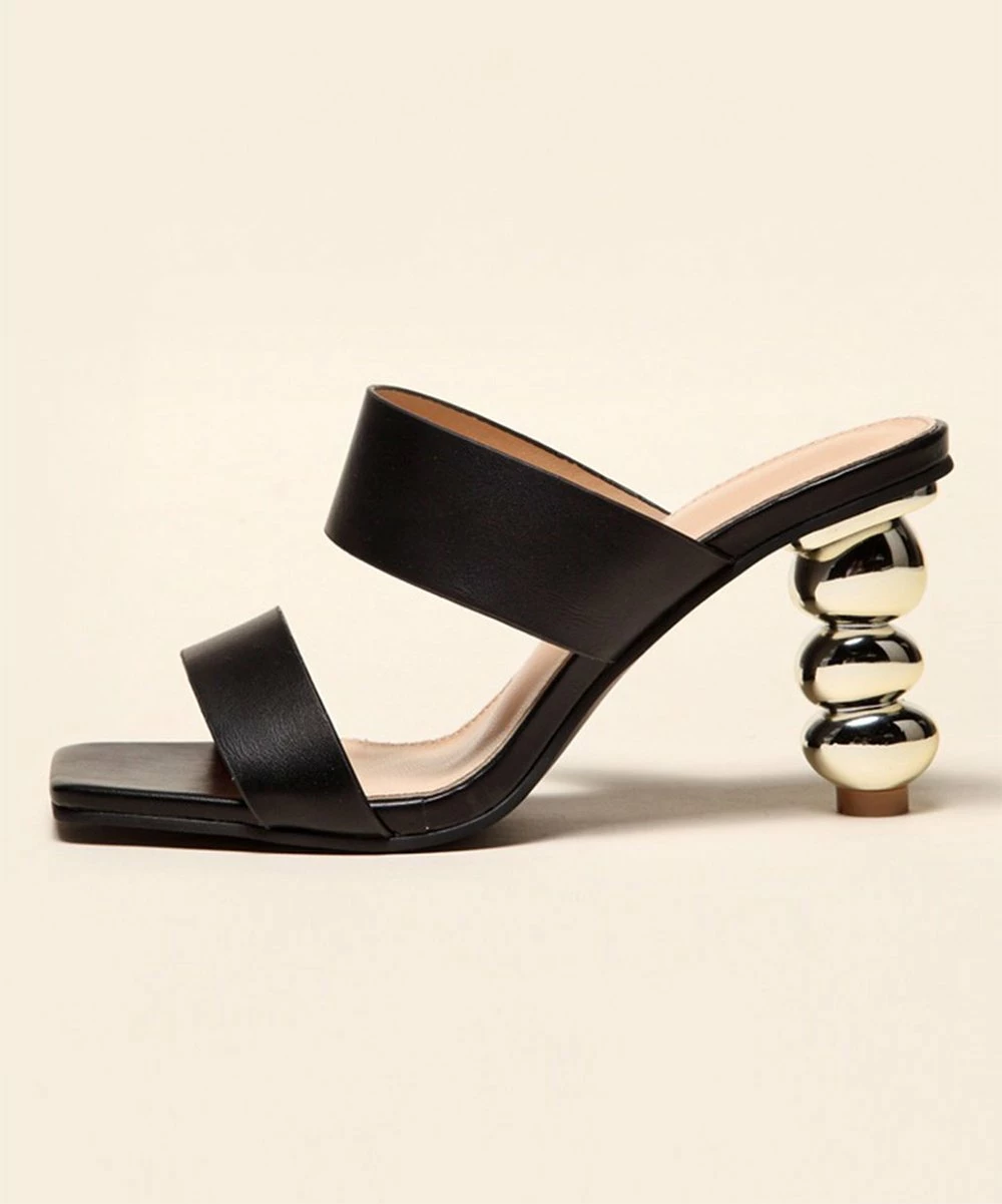 Slip on these double-strapped sandals with an artistic heel and add a unique element to your outfit.