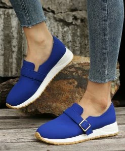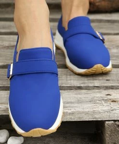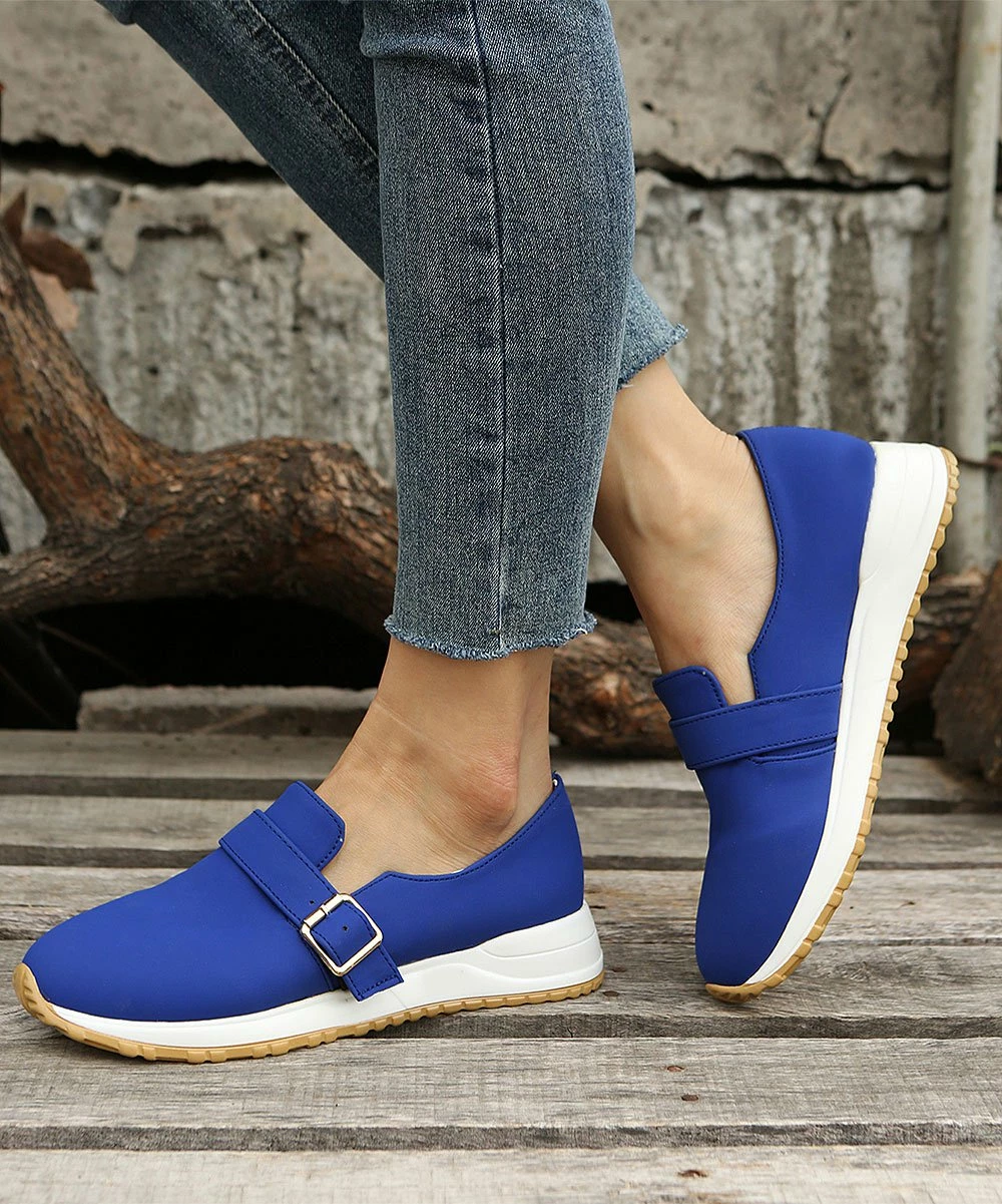 Easy-on sneaker dressed up a bit with a gleaming buckle accent at the side.