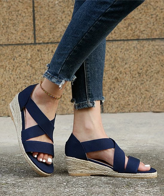Summon thoughts of tropical giveaways by heading out in this crisscrossing sandal that features a rope-wrapped espadrille sole and a chunky wedge heel.
