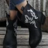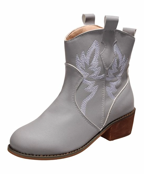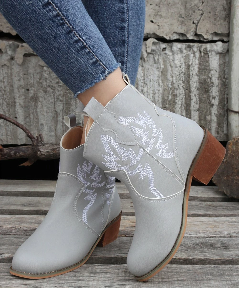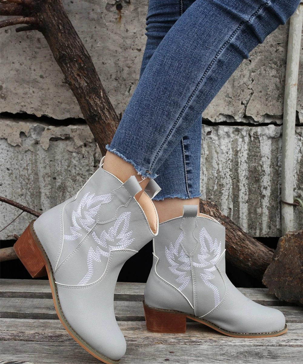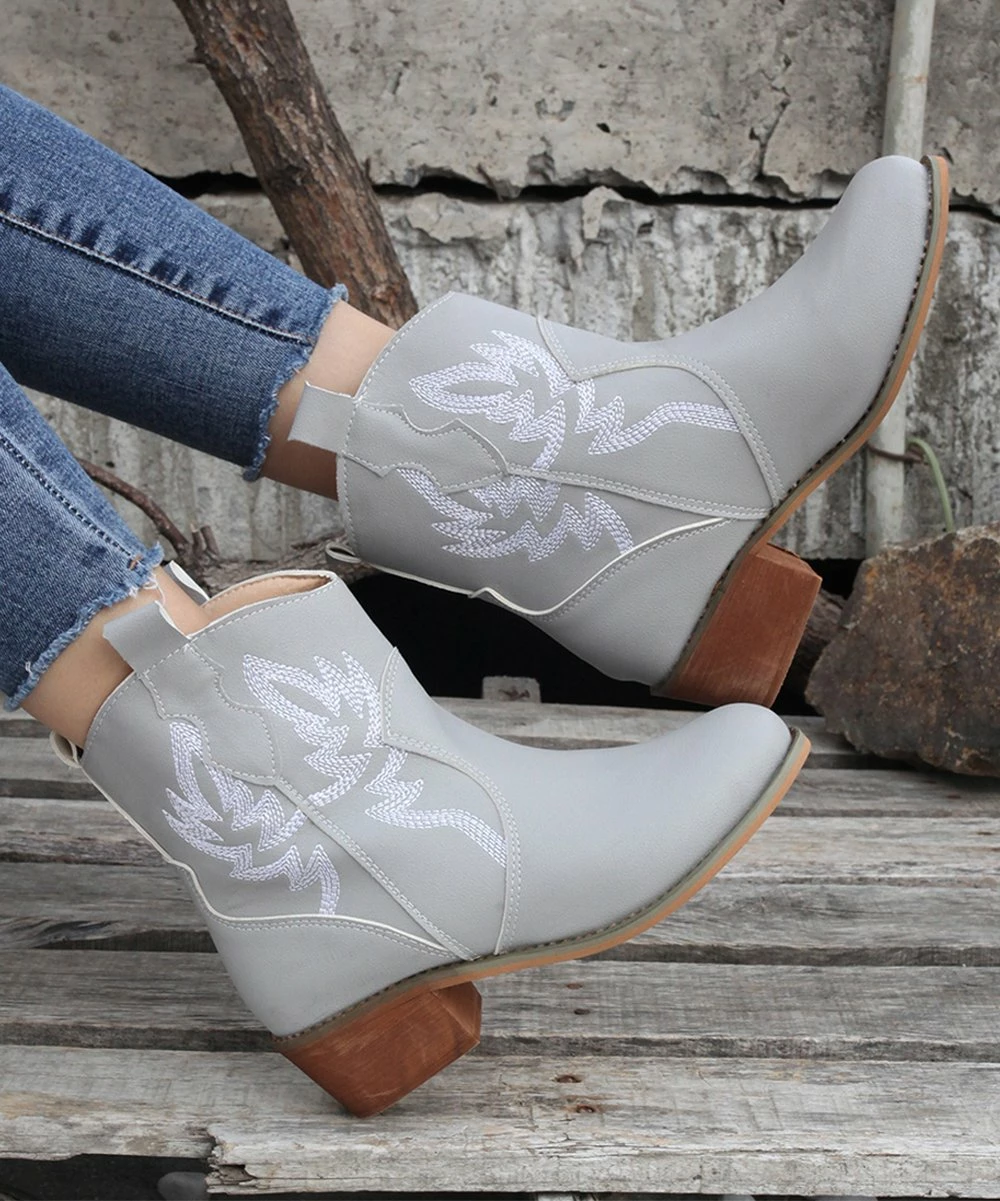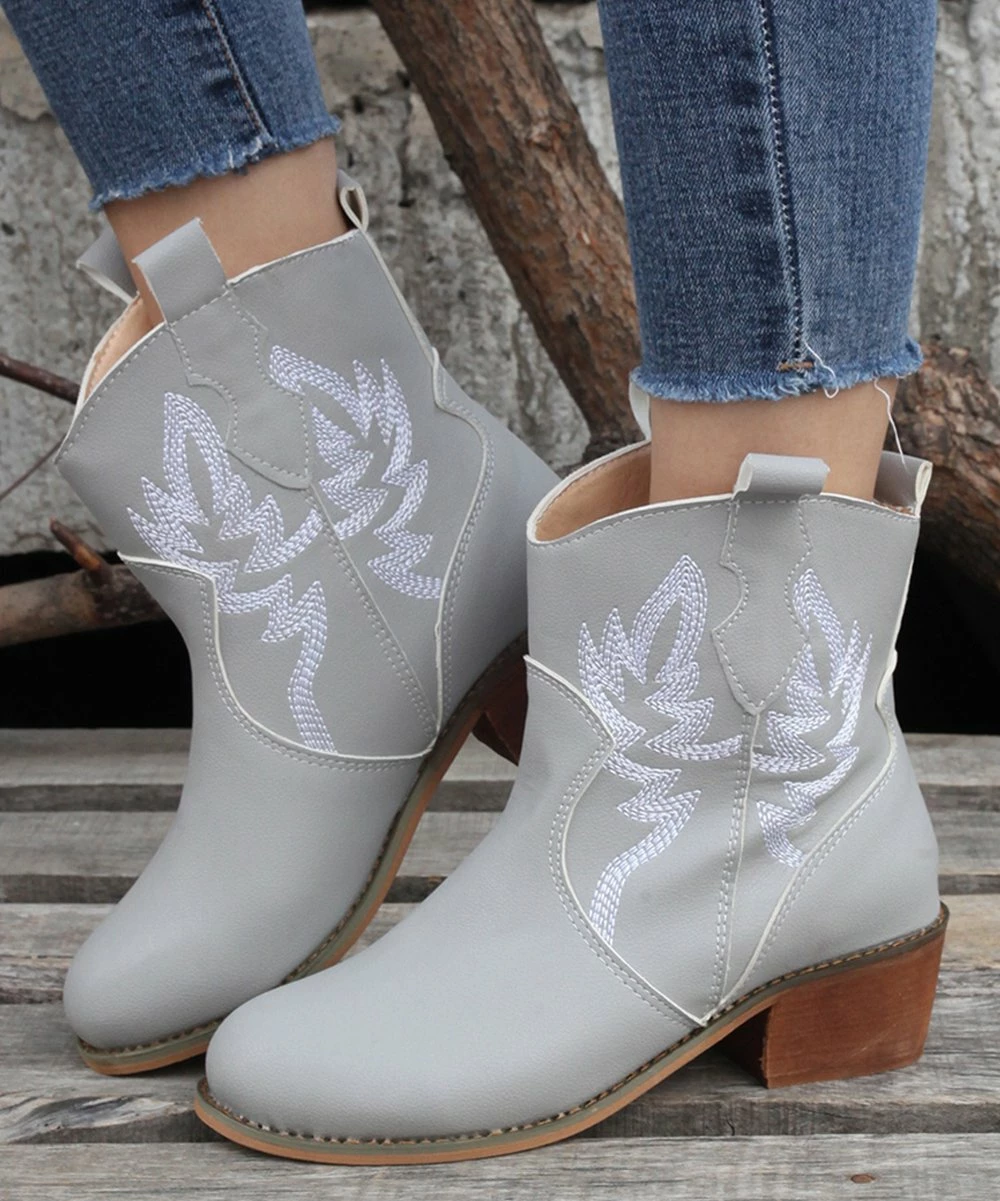 Step out in these short cowboy boots featuring a contrasting geometric stitch low heel and rubber sole.