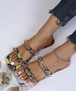 Energize your laid-back look with the snappy snake print of this flat sandal complete with sleek chain detail across the straps. The skid-resistant sole help keep your foot grounded with every step.