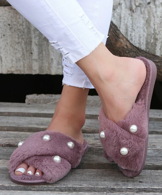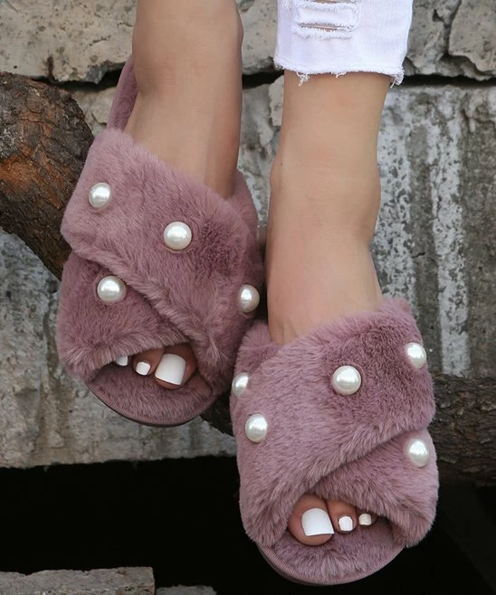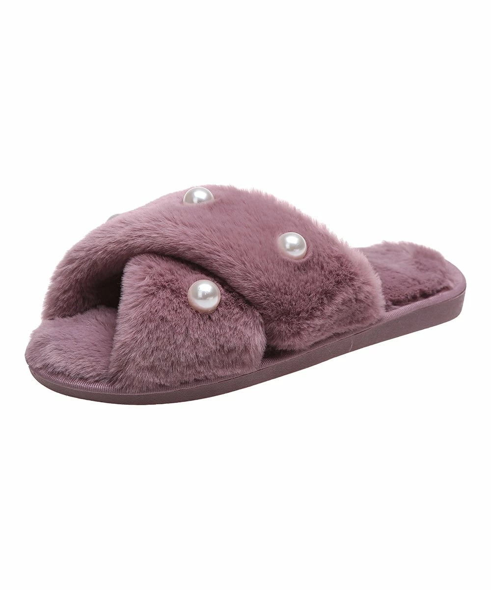 Pamper your feet with these plush slippers featuring faux pearl beads.