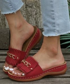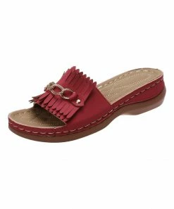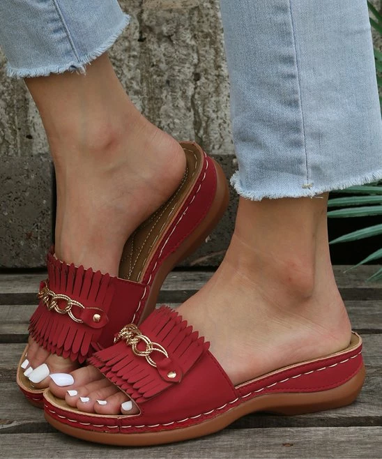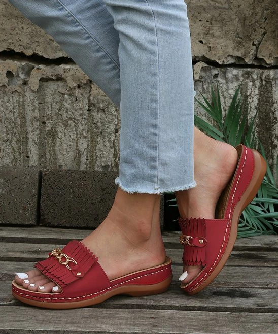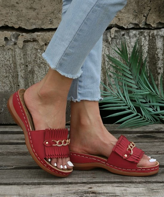 Spruce up your sunny-day selections with these slides featuring a chain-strap detail.