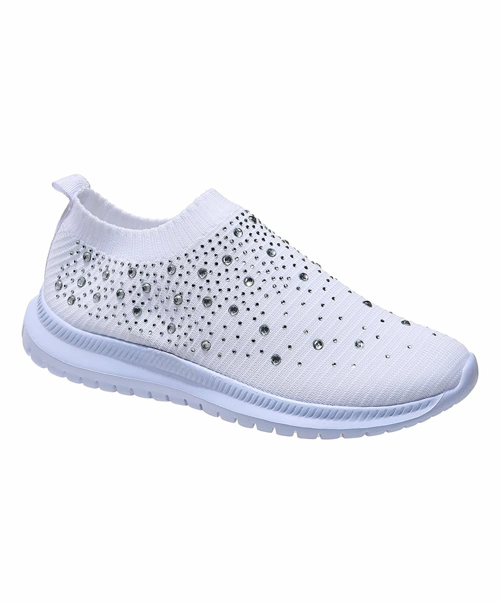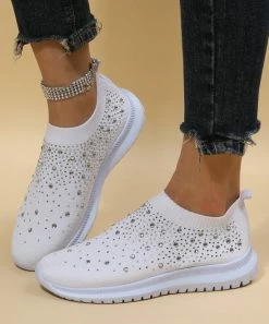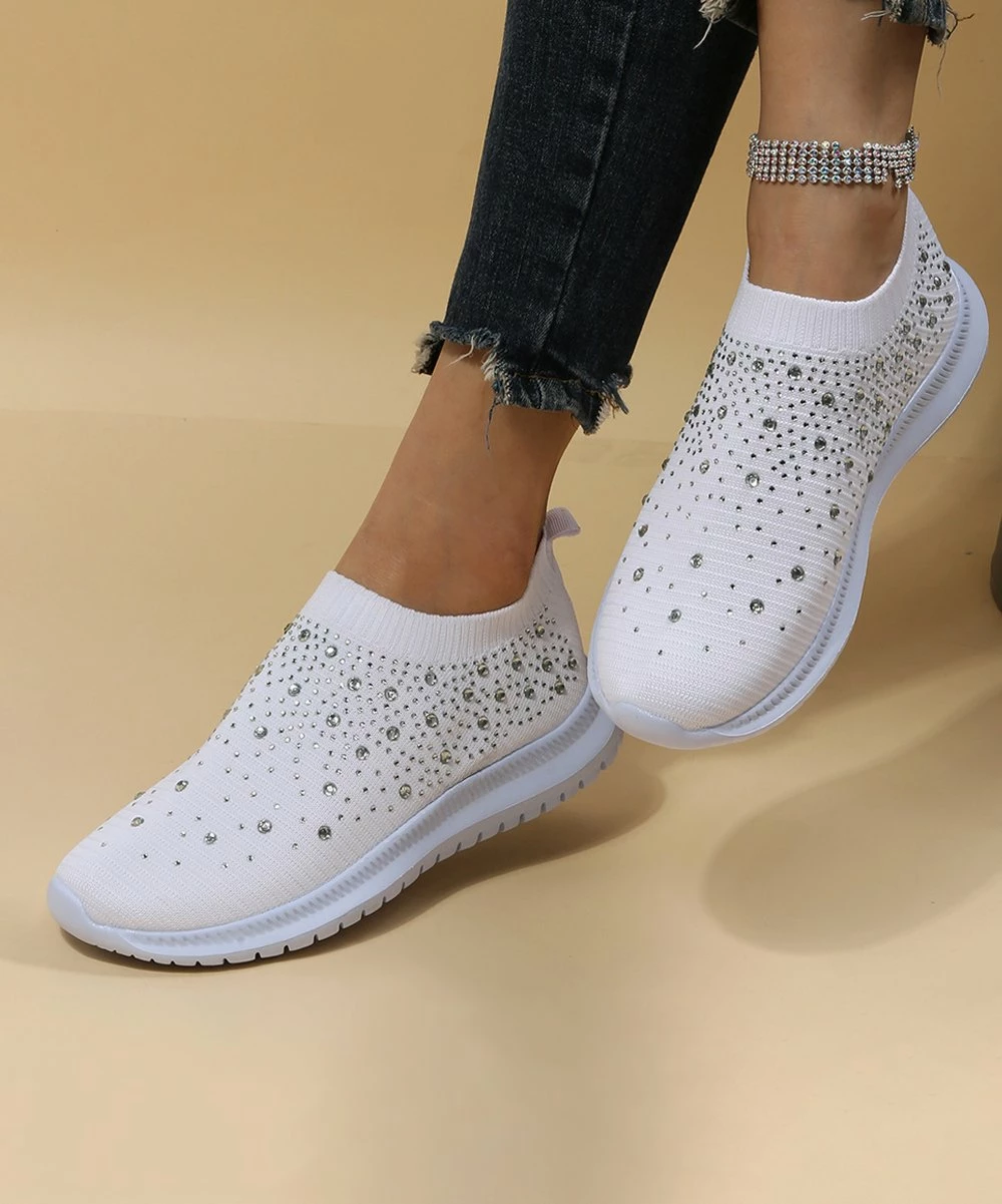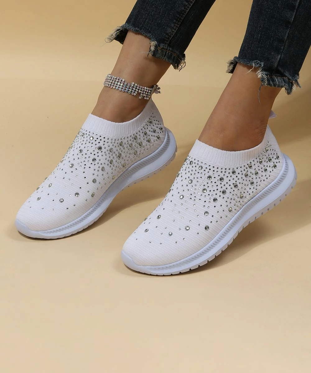 The sock-like top of these sneakers is decorated with shimmering stones to elevate the breathable textile upper.