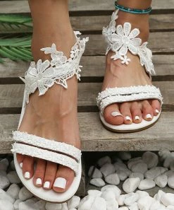 Elevate your footwear collection with these eye-catching sandals adorned with a lacy floral strap.