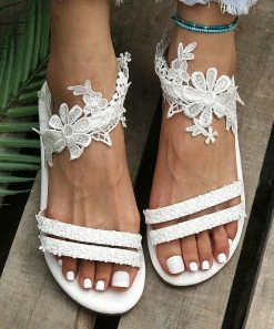 Elevate your footwear collection with these eye-catching sandals adorned with a lacy floral strap.