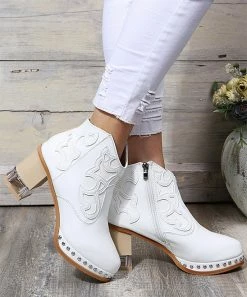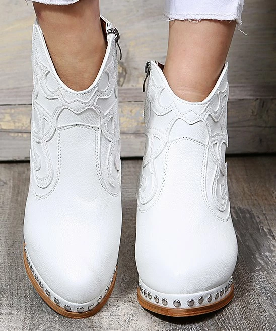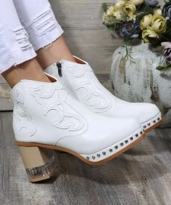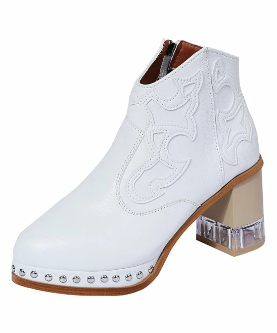 Add a unique flair to your footwear collection with this western-style ankle boot that boasts a stud-adorned toe and a heel with a transparent bottom.